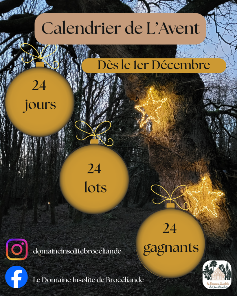 Le Domaine Insolite de Brocéliande, dont le siège social est situé au 35, rue du Chevalier Lancelot du Lac – 35380 PAIMPONT(ci-après l’« Organisateur ») souhaite organiser un jeu-concours intitulé « Calendrier de l’avent » dont les gagnants seront désignés dans les conditions définies ci-après. Le calendrier de l’avent se déroulera du mardi 1 décembre 2025 9h00 au dimanche 28 décembre 2025 23H59 (date et heure française de participation faisant foi).